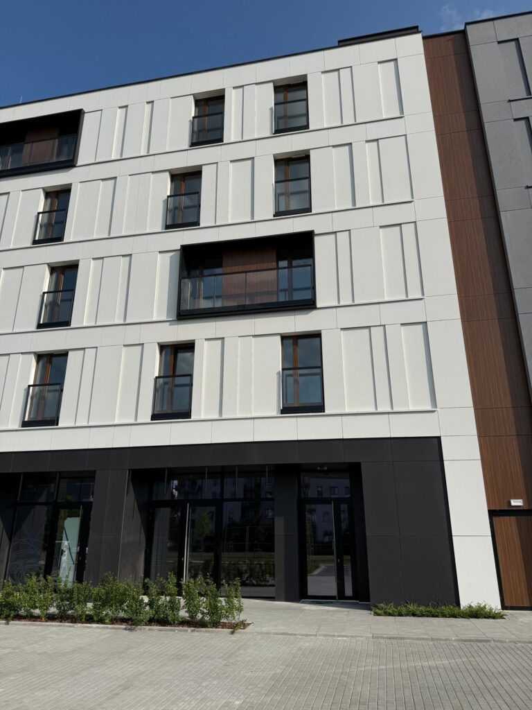Wyrazisty nadruk pełni funkcję dekoracyjną i osłonową, podkreślając nowoczesny charakter elewacji. Obecnie w budynku trwają prace wykończeniowe.